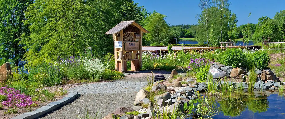 Von der Tourist-Information oberhalb des Sees folgen wir dem asphaltierten See-Rundweg Richtung See-Hotel und dem nahe gelegenen Wald. Wir passieren das Eingangsportal zur Stausee Tafeltour rechter Hand und schreiten ebenfalls auf der rechten Seite am Waldrand durch das Holzportal der Garten-Wellness-Runde.